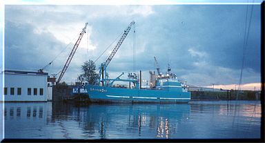 A rare quiet evening at our facility. Photo taken by one of our neighbors, Margaret Johnson. The photo is of the fishing vessel, Siberian Sea, just after coming off drydock and before starting its trip up the inland passage to Alaska.